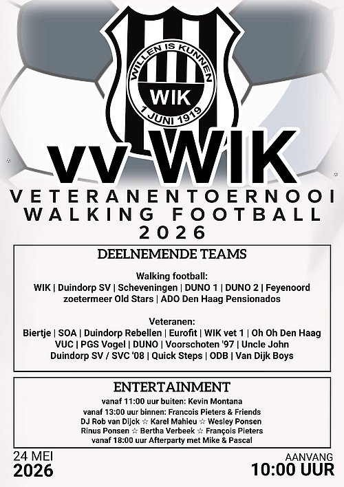 Deelnemers en muziek W.I.K.-veteranen & walking football toernooi 26 mei 2026 bekend